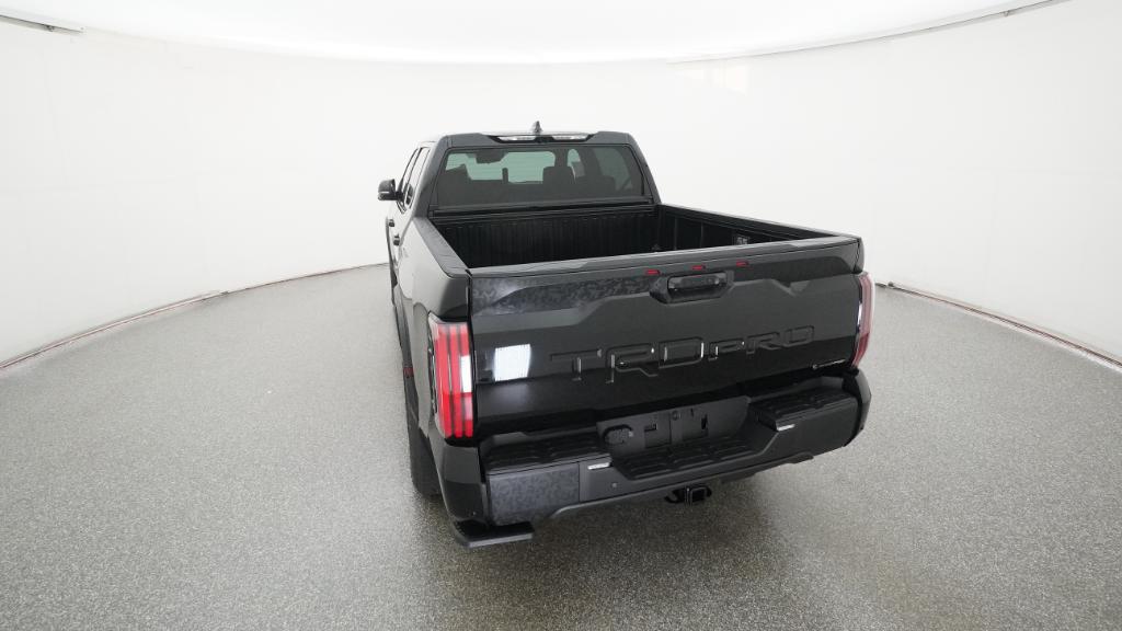 - "TRD PRO" hood badge; black door handles; black window molding and mirror caps; black technical-camo-grained tailgate spoiler and overfenders with marker lights